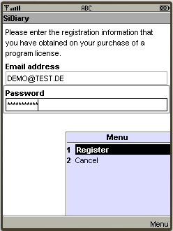 Enter your username and password (case-sensitive!) from SiDiary-Online and press on 'Menu ->Register' to finish the registration: