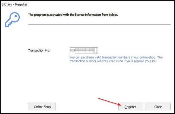 If you have purchased a SiDiary USB stick, you can find the transaction number by starting SiDiary on the stick and then switch into the menu 'Help -> Register'.