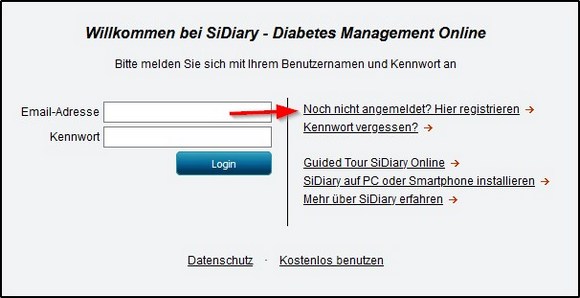 1. SiDiary-Online einrichten:Falls Sie noch kein Konto bei SiDiary-Online haben können Sie das jetzt einrichten. Falls Sie die Seite in englisch sehen können Sie sie mit einem Klick auf die Deutsche Flagge rechts oben auf deutsch umschalten. Klicken Sie dann auf den Link 'Noch nicht angemeldet? Hier registrieren'.