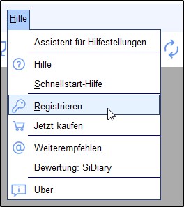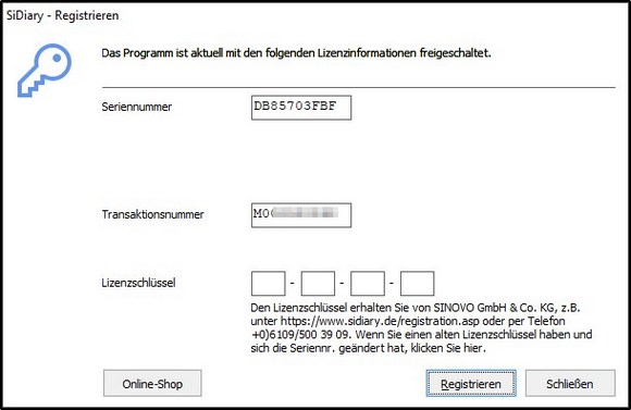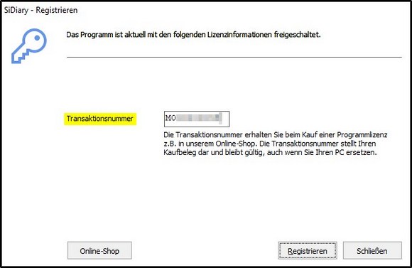 Falls Sie einen SiDiary USB-Stick erworben haben, finden Sie die Transaktionsnummer, indem Sie SiDiary auf dem Stick starten und dann ins Menü 'Hilfe ->Registrieren' wechseln.