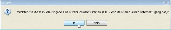 SiDiary fragt dann, ob Sie den Lizenzschlüssel manuell eingeben wollen. Klicken Sie auf 'Ja':
