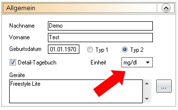 Selbstverständlich unterstützt unsere Software das Arbeiten sowohl in mmol/l als auch in mg/dl!