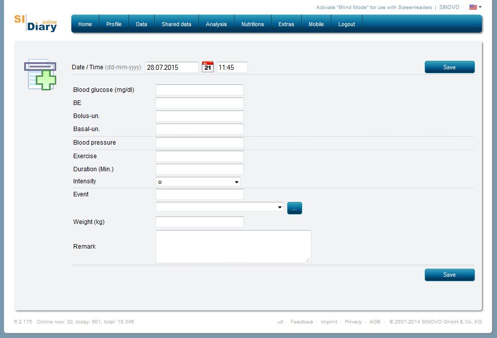 Your diabetes management becomes more flexible with SiDiary Online. You just need a web browser (for example Internet Explorer, Firefox or Safari) to start it. With the assistance of these web browsers, even users of Linux or Apple can benefit from SiDiary easily. SiDiary Online is now equipped perfectly even for browsers on mobile devices (Smartphone, Blackberry, Android or iPhone): The space, which is available on the displays of the devices, is fully utilized. If you wish, you can install a cookie allowing you to log in nearly automatically. If you choose the mask 'Enter single data' as your default start screen, you can enter your data right from the start of SiDiary Online.